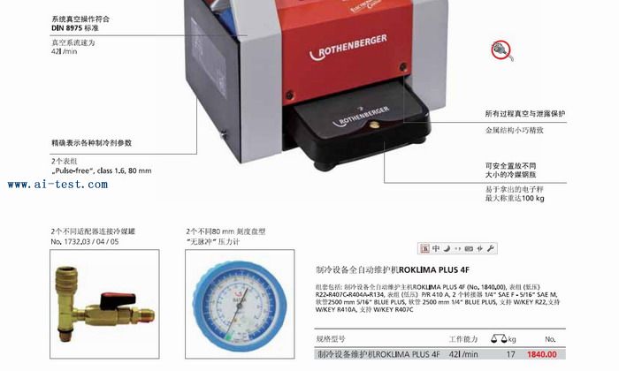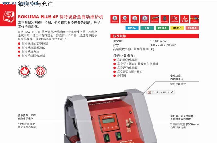 制冷設備全自動維護機 :真空度:1*0.01;尺寸:390*270*390mm;高精度數字稱:最高稱100kg;工作能力:42L/min;重量:17kg;品牌:德國ROTHENBERGER