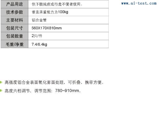 助行器;垂直承重能力為100公斤;主要材料:鋁合金管;包裝尺寸:560×170×810mm;高度六檔調節,調節范圍:780-910mm。品牌:YUYUE。